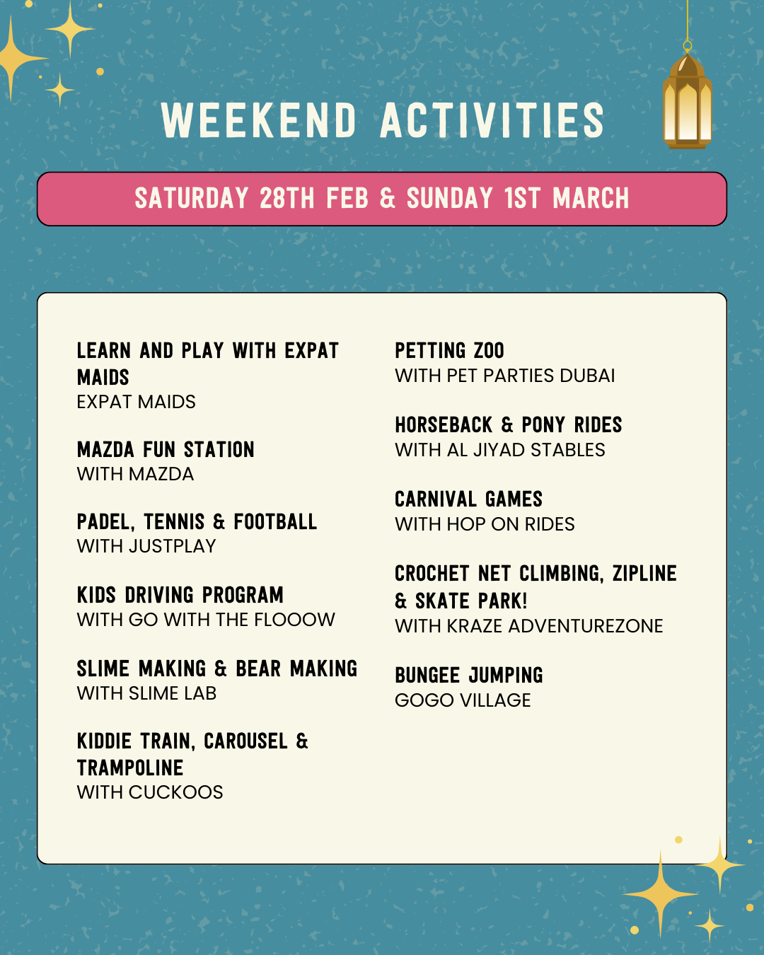 With 5 outdoor padel pitches, Just Play Padel is your go-to outdoor activity zone from 3:45 PM to 11:15 PM.
